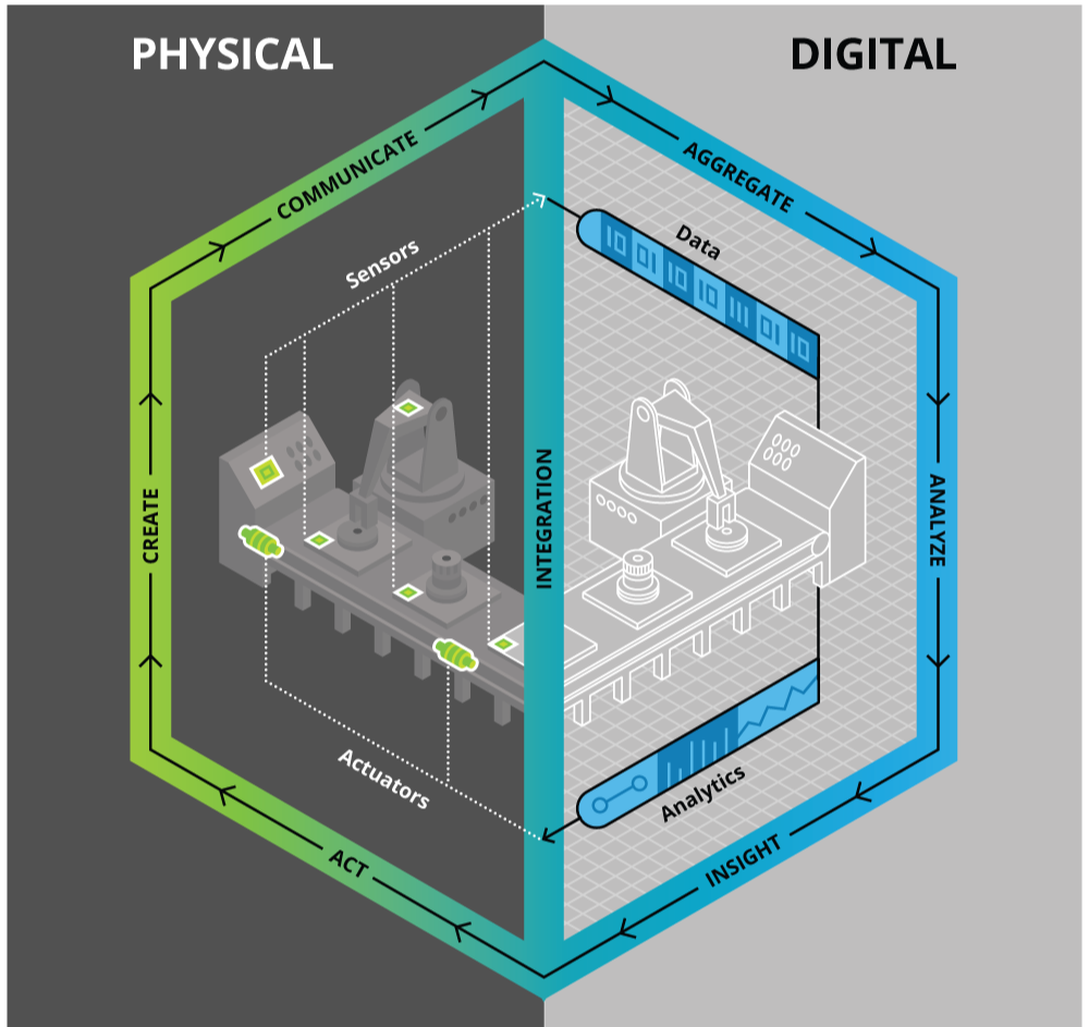 Visualization of Industry 4.0 principles showing the integration of physical industrial processes with digital data analytics through sensors, actuators, and digital twins for smart manufacturing