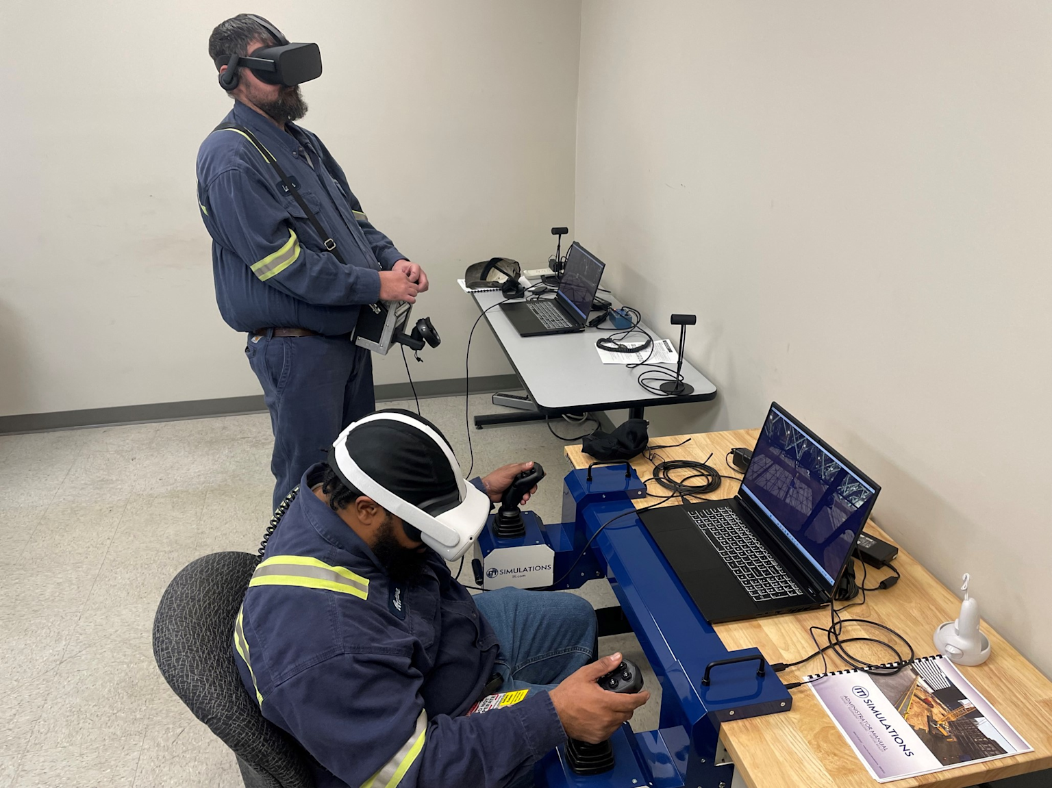 Two workers using virtual reality headsets and simulators for industrial safety training with heavy machinery